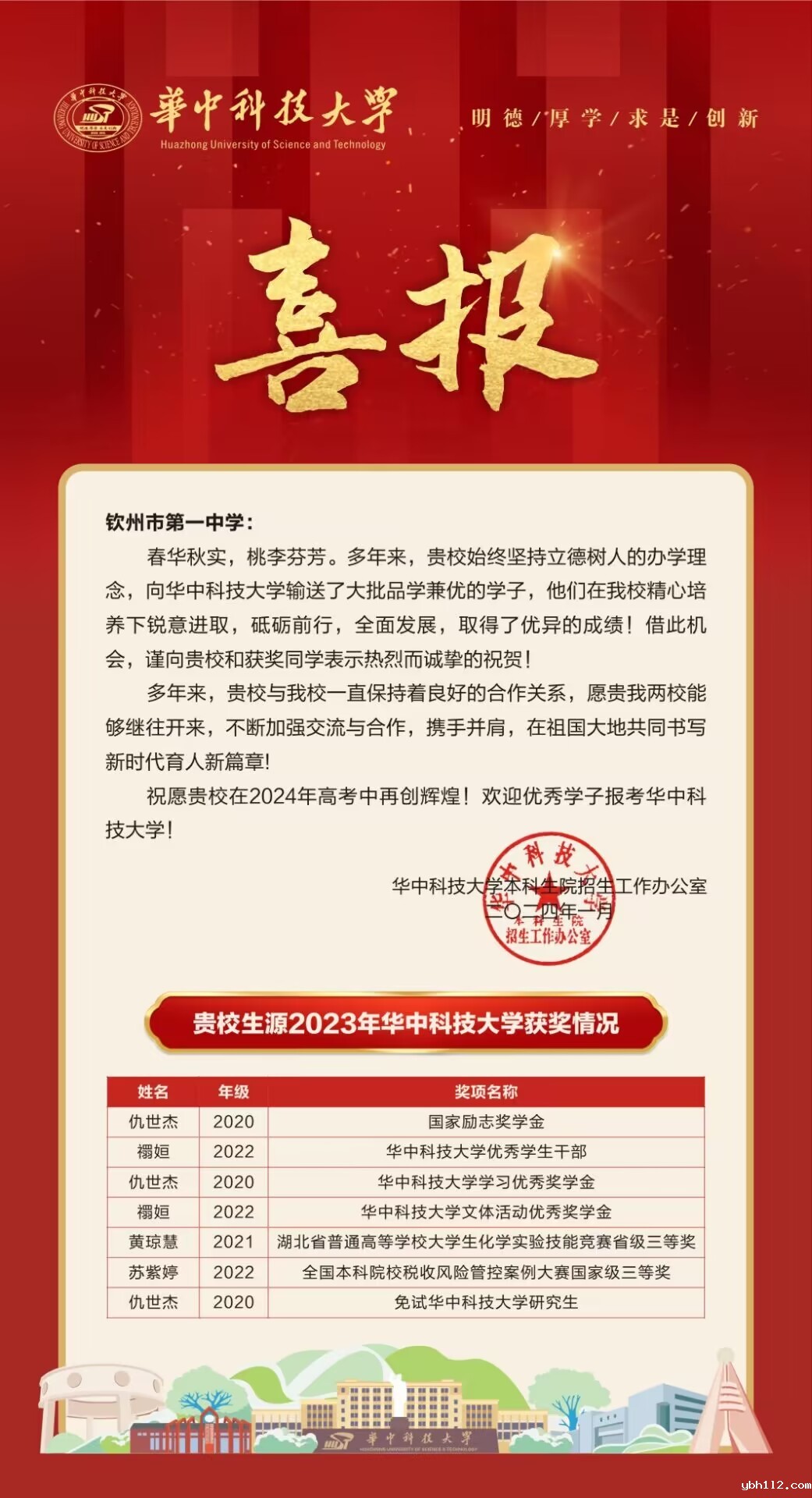 近日,华中科技大学本科生招生办公室向我校发来喜报,为在华中科技大学学习的仇世杰、禤姮、黄琼慧、苏紫婷等我校优秀毕业生的优异成绩表示祝贺。