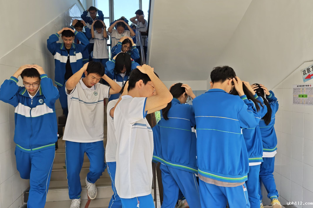 随着警报声的响起,演练正式开始。听到警报声后,各班老师立即组织学生进行应急避震。同学们迅速躲在课桌下,用书本或双手护住头部,蜷缩身体,尽可能降低受伤风险。随后,在老师们的指挥下,高一高二的全体学生双手护头,按照预定的疏散路线,每班分两路纵队迅速、有序地沿着楼梯撤离,最终抵达操场。整个疏散过程紧张而有序,各楼梯口均有老师值守,防止意外发生。